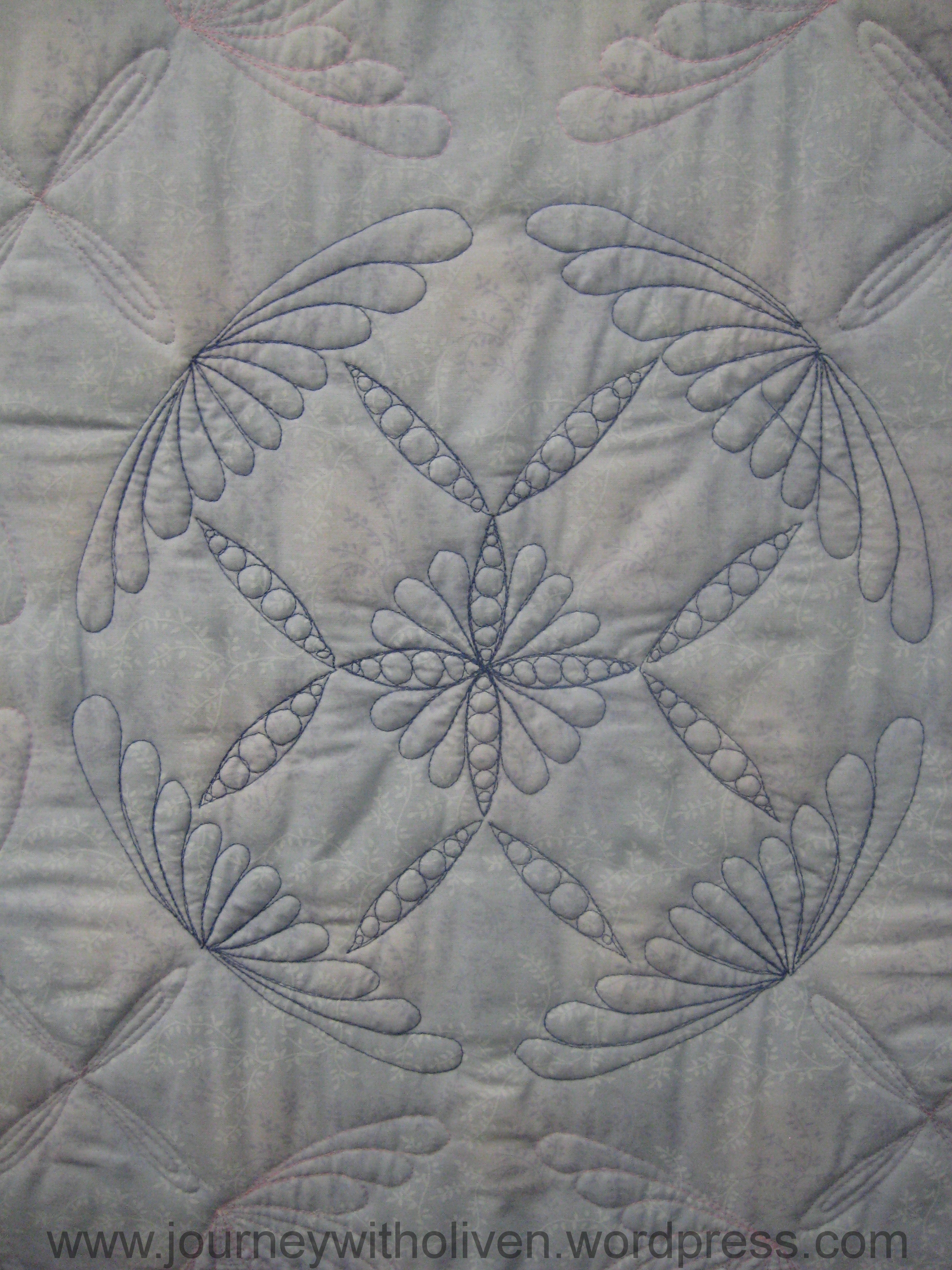This is the quilting of the centre – which has all been un-picked and quilted again with a new choice of threads …. All the un-quilted places are windows on the other side.