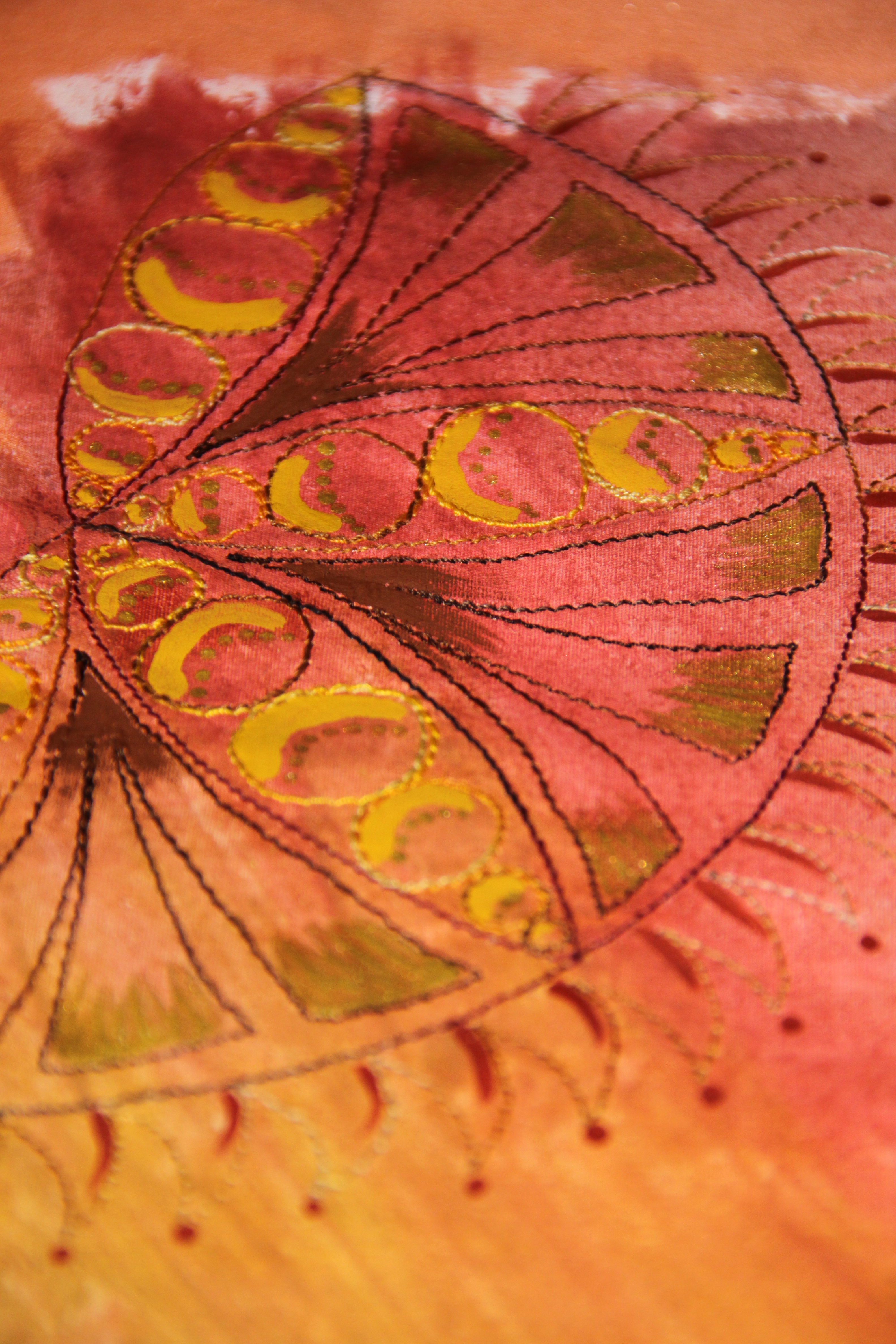 soluble, but once wetted they are permanent. So I tried this to create a nice background and then I inserted water soluble pen into my compass, draw basic shapes of Mandala and took the whole piece under the machine and “HAD A BALL” It was so enjoyable to stitch the shapes!! I made one little one before Christmas and covered a small notepad with it and gave it to Olivier’s mum for Christmas and couple of days ago I made larger one, also as a present for a friend who helped me a lot before Christmas.